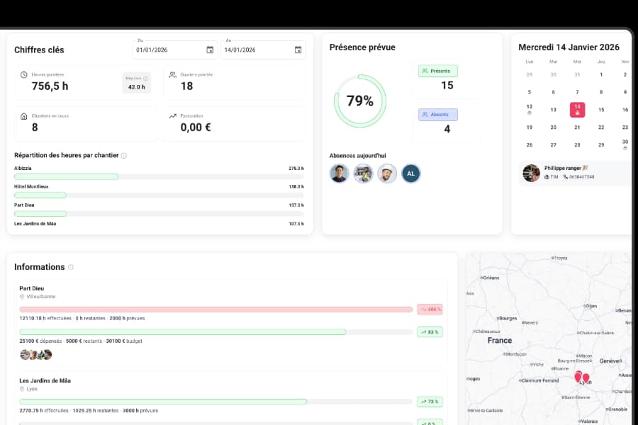 Les chefs d’équipe disposent d’une vision directe sur les heures de leurs équipes et l’organisation des chantiers. Ils peuvent suivre les pointages, anticiper les besoins et assurer une coordination fluide entre le terrain et le bureau.