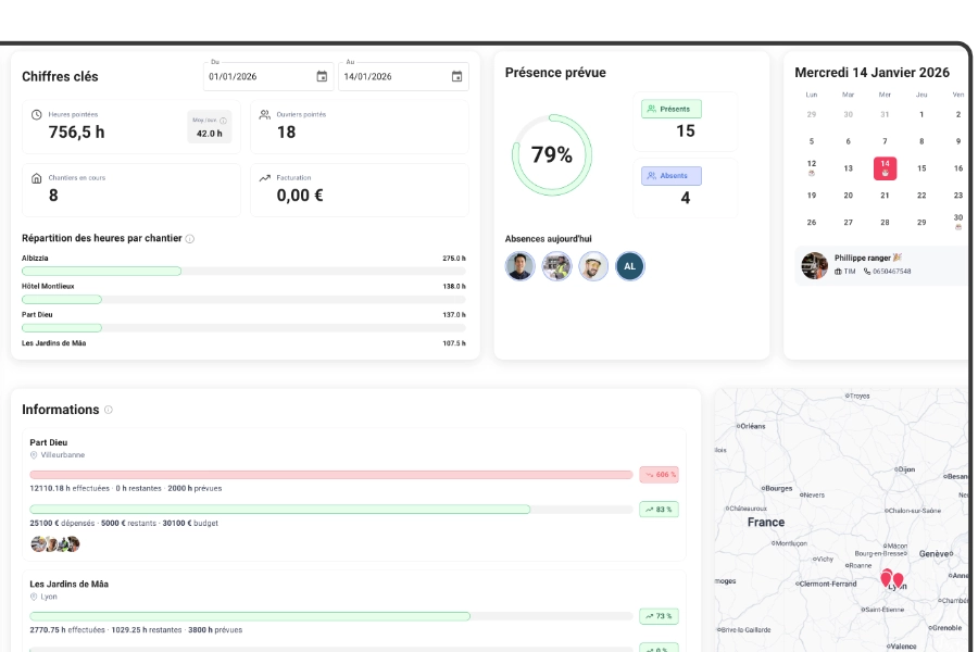 Toute votre gestion de pointage, de feuilles d’heures et de planning chantier au même endroit