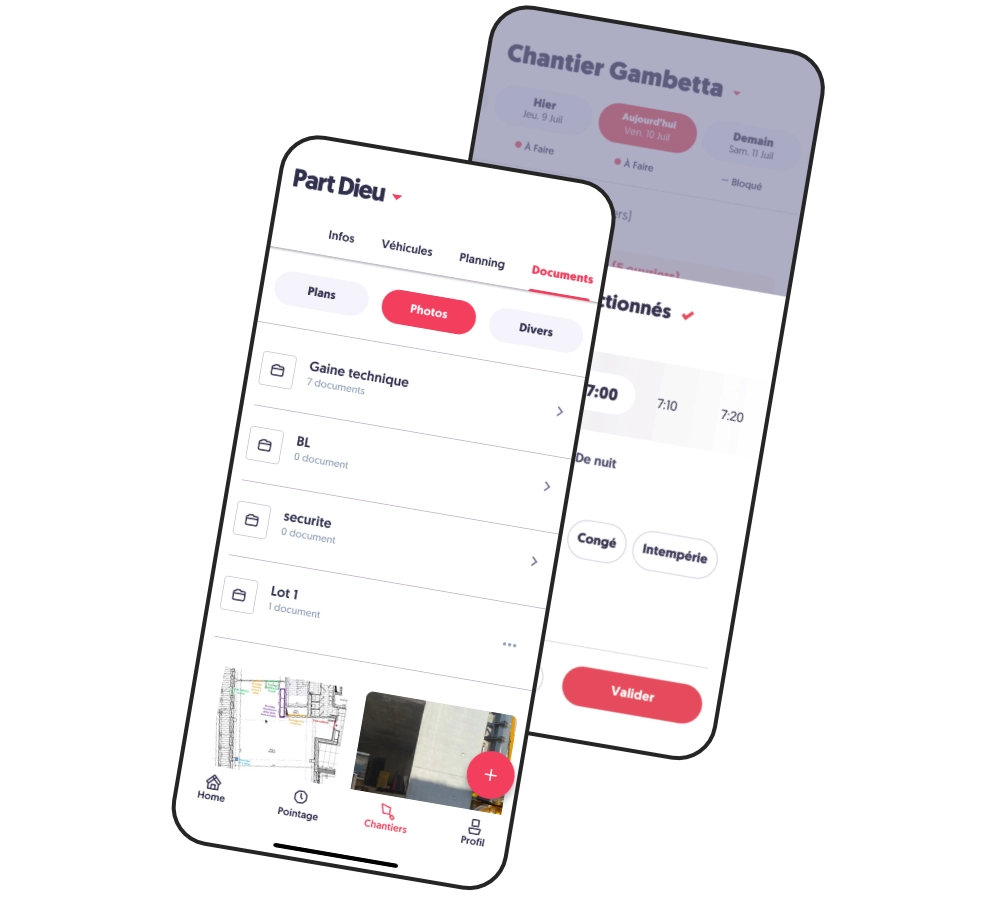 Disponible sur Apple Store et Google play, vos conducteurs de travaux et vos chefs de chantiers seront informés en temps réel des dernières modifications. Le pointage de vos équipes sera fluidifié par l’envoi des données quotidiennes.
