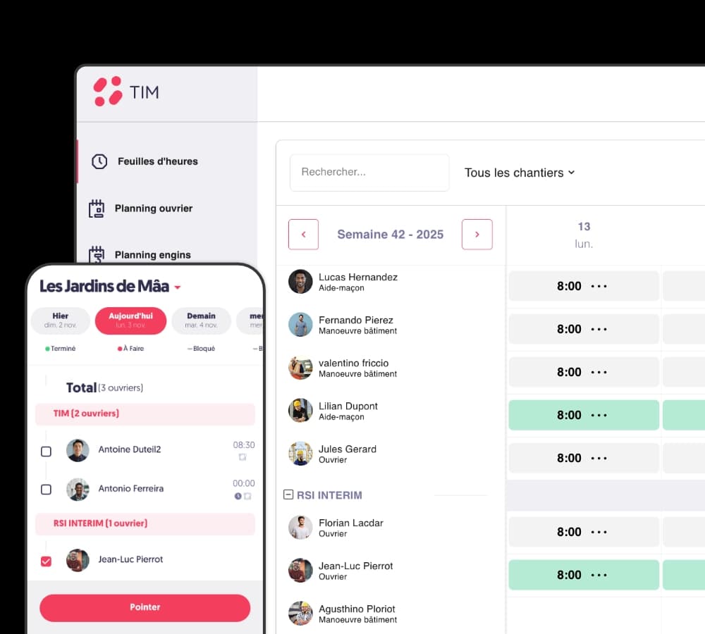 Chaque ouvrier ou chef d’équipe pointe ses heures directement depuis son smartphone ou sa tablette, en temps réel.